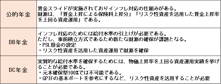 以上をまとめると現在のわが国の年金制度のインフレへの対応可能性は、以下のように整理できます。