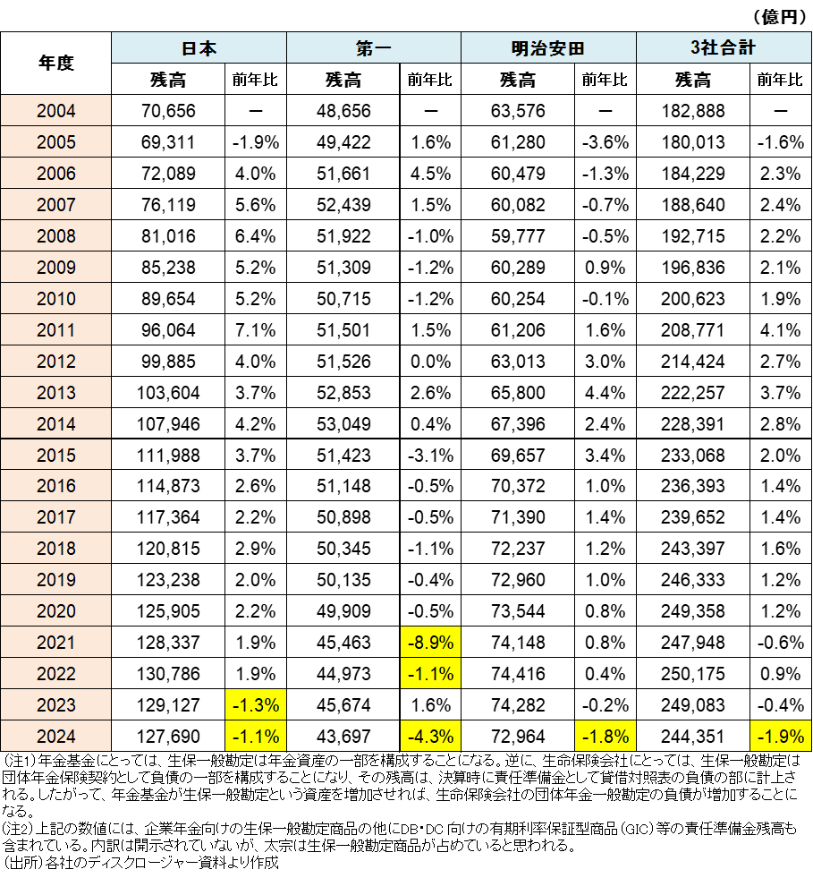 下の表は、生保一般勘定の残高が多い大手生保 3 社の、団体年金(一般勘定)の責任準備金推移をまとめたものです。