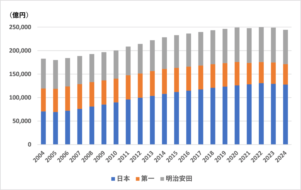 しかしながら、明治安田生命の一般勘定残高は2023年度から減少に転じ、2024年度にはマイナス1.8%の減少幅となりました。