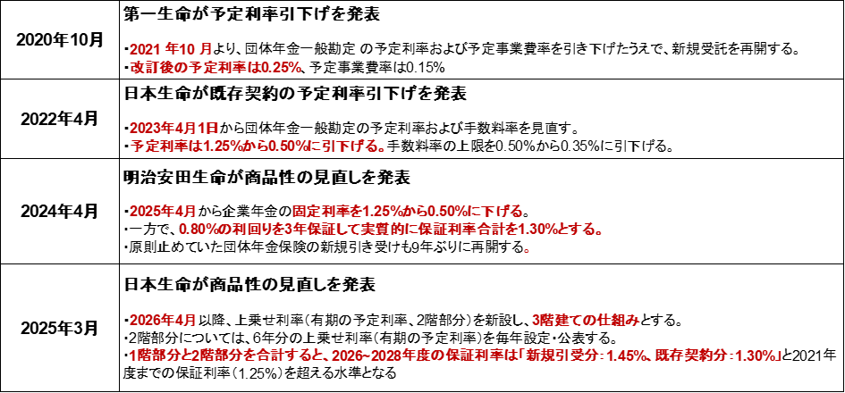 一方で、第一生命・日本生命・明治安田生命は生保一般勘定の予定利率を引き下げ、商品性も見直しました。